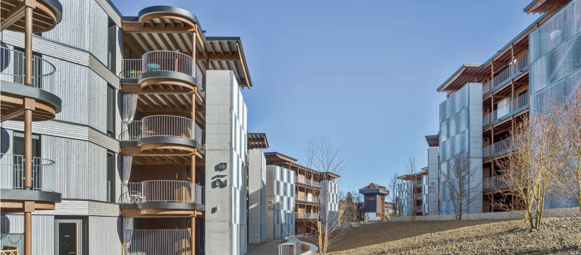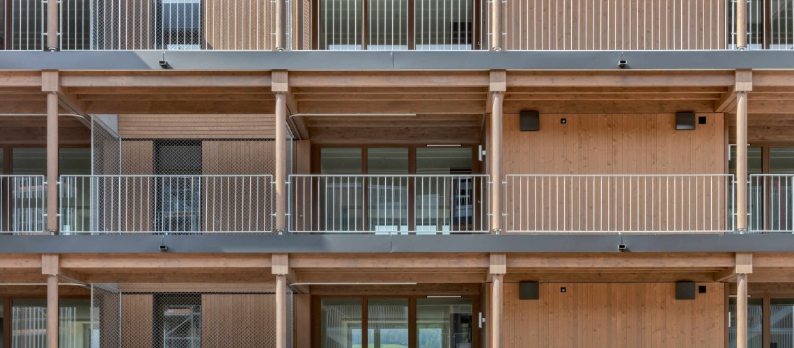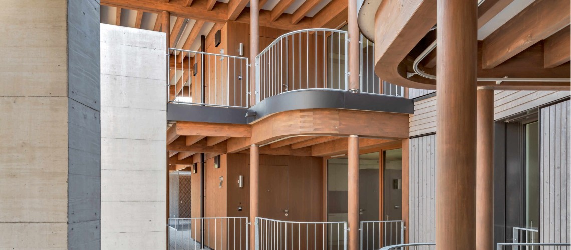 Il complesso Waldacker è costituito da due lunghe file di edifici che si abbracciano lungo il terreno naturale. Insieme formano uno spazio interno che funge da area di incontro e comunicazione per i residenti. A partire dal piano seminterrato superiore, gli edifici sono stati costruiti quasi interamente con struttura in legno con cassaforma in legno di abete rosso chiusa e retroventilata, compresi i vani ascensore. La costruzione in legno è stata ispirata dalla storica torre Tröckneturm, che si trova proprio accanto alla sovrastruttura.
