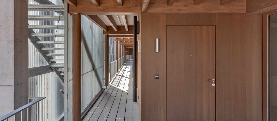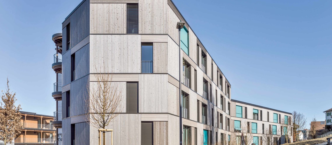 Lo spazio abitativo presenta aree su entrambi i lati sottoforma di verande e giardini d'inverno integrati. Gli appartamenti sono accessibili attraverso un porticato continuo; l'accesso avviene tramite scale esterne coperte. Sui tetti sono stati installati impianti fotovoltaici e la fornitura di calore è assicurata dalla rete di teleriscaldamento della città di San Gallo. Tra le due linee di costruzione c'è uno spazio interno completamente verde con parco giochi e nicchie per sedersi. Il quartiere deve essere il più possibile chiuso al traffico. Sono presenti numerosi parcheggi per biciclette e stazioni di ricarica per e-bike e auto elettriche. Ci sono anche veicoli Mobility che possono essere utilizzati dagli inquilini.